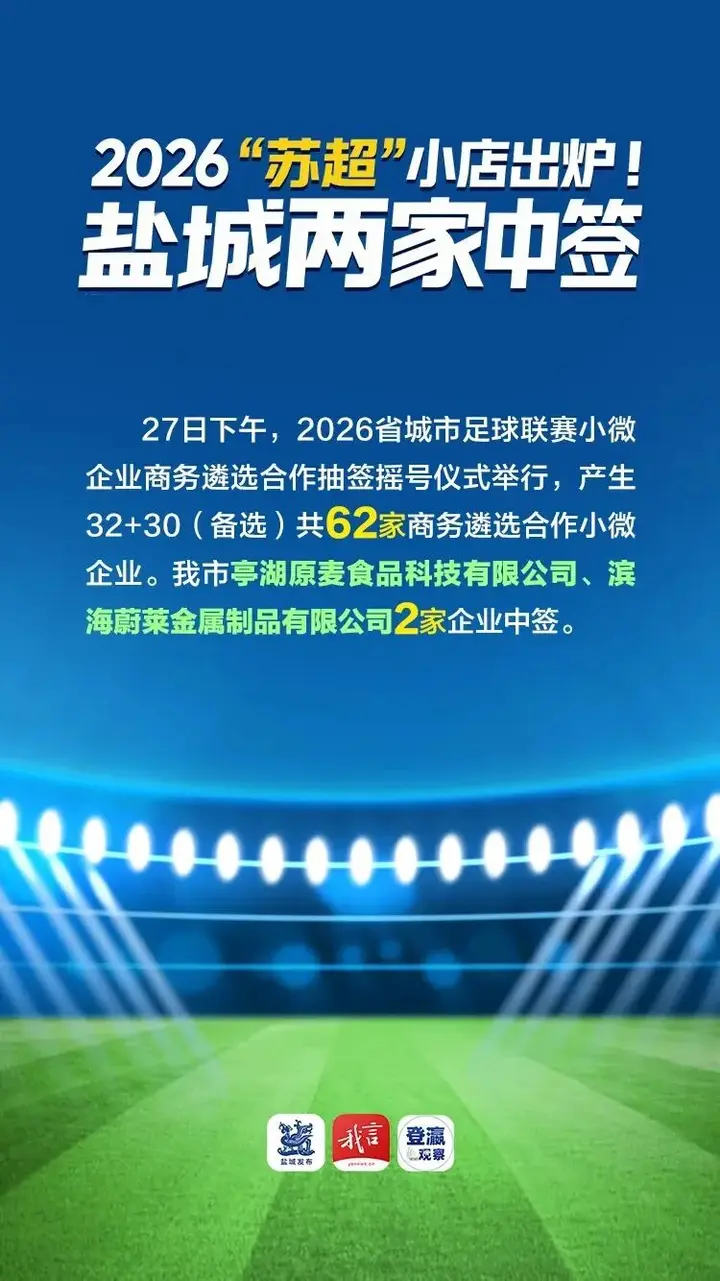 2月27日,滨海蔚莱金属制品有限公司负责人辛大宇坐在自家阳台上刷手机。当刷到2026年江苏省城市足球联赛小微企业商务遴选合作结果推送时,一开始没当回事,“滑”了过去,再刷到这条推送时,猛然想起自己曾报名参加遴选,定睛细看,公司赫然列在32家拟中选企业名单里。