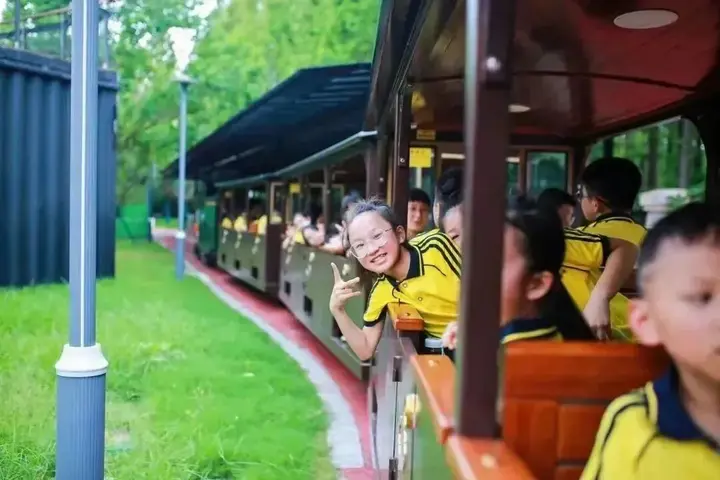 黄海森林公园里,小火车穿行林海,孩子们在智慧草坪上奔跑,在木育森林里动手——自然是最好的课堂,成长是最美的收获。