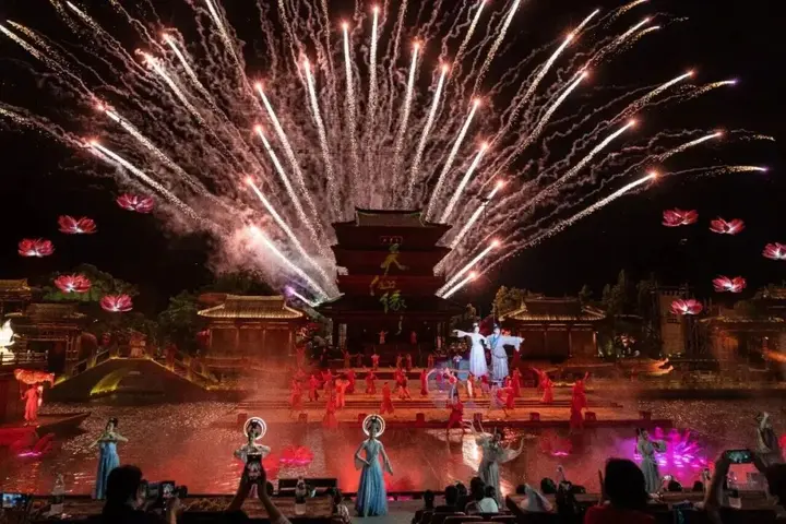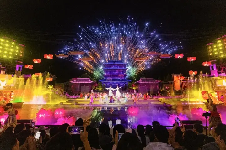 初春的风拂过大洋湾,樱花即将缀满枝头。唐风建筑在花影里静静铺展,青砖黛瓦间,歌舞翩然上演,渎里风华穿越千年扑面而来。待到夜幕降临,《盐渎往事》在水光夜色中拉开大幕,沉浸式的演绎让那些关于盐与城的记忆,在光影里重新活了过来。