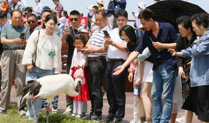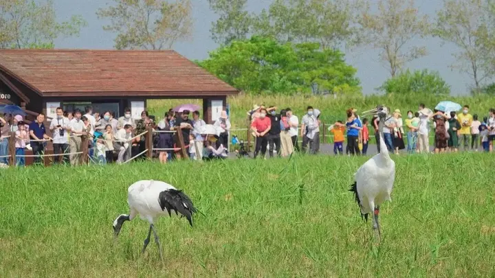 纪录片里的丹顶鹤在丹顶鹤湿地生态旅游区飞进现实,小鹤课堂看野化训练,登上观鸟塔用望远镜追随候鸟的翅膀。