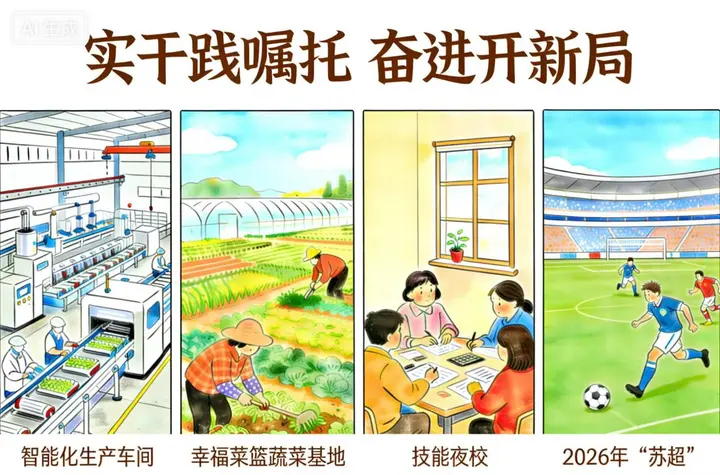 实干践嘱托,归根在勇担当、见行动。江苏广大干部群众将总书记的重要讲话精神,转化为扎根一线、落地见效的干事创业动力,在各地各领域展现实干担当。江苏东磁新能源智能化生产车间里,自动化生产线全速运转,跑出产业创新加速度;句容边城镇衣庄村幸福菜篮蔬菜基地中,农户们耕耘不辍,孕育乡村振兴新希望;盐城大丰“技能夜校”点亮群众增收之路,让技能成为改变生活的“金钥匙”;2026年“苏超”也将于4月11日开赛,历时6个多月、共91场比赛,将体育赋能发展的实践持续深化。从产业创新前沿到乡村振兴沃土,从民生改善一线到体育赛场,江苏各地处处涌动着真抓实干、奋勇争先的发展热潮。