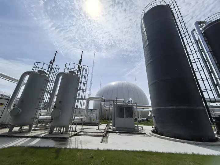 4月16日,记者走进大丰区草庙镇项目现场,一座8000立方米的巨型沼气储气球包格外醒目,6座厌氧发酵罐整齐排列。预处理车间里,秸秆经破碎后与畜禽粪污按比例混合,在50-55℃高温和专利气流搅拌技术下发酵产气。沼气经脱硫提纯变成生物天然气,转化率高达65%。