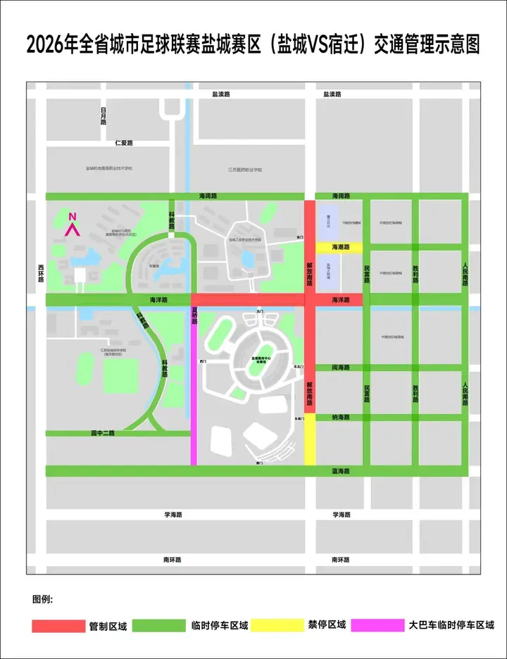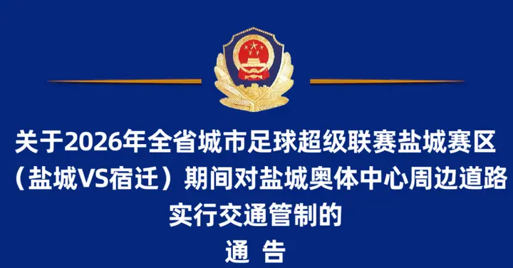 2026年全省城市足球超级联赛盐城赛区(盐城VS宿迁)将于4月25日19:40—21:40在盐城奥体中心体育场举办。根据《中华人民共和国道路交通安全法》等法律规定,比赛期间对盐城奥体中心周边道路实行临时交通管制。现通告如下: