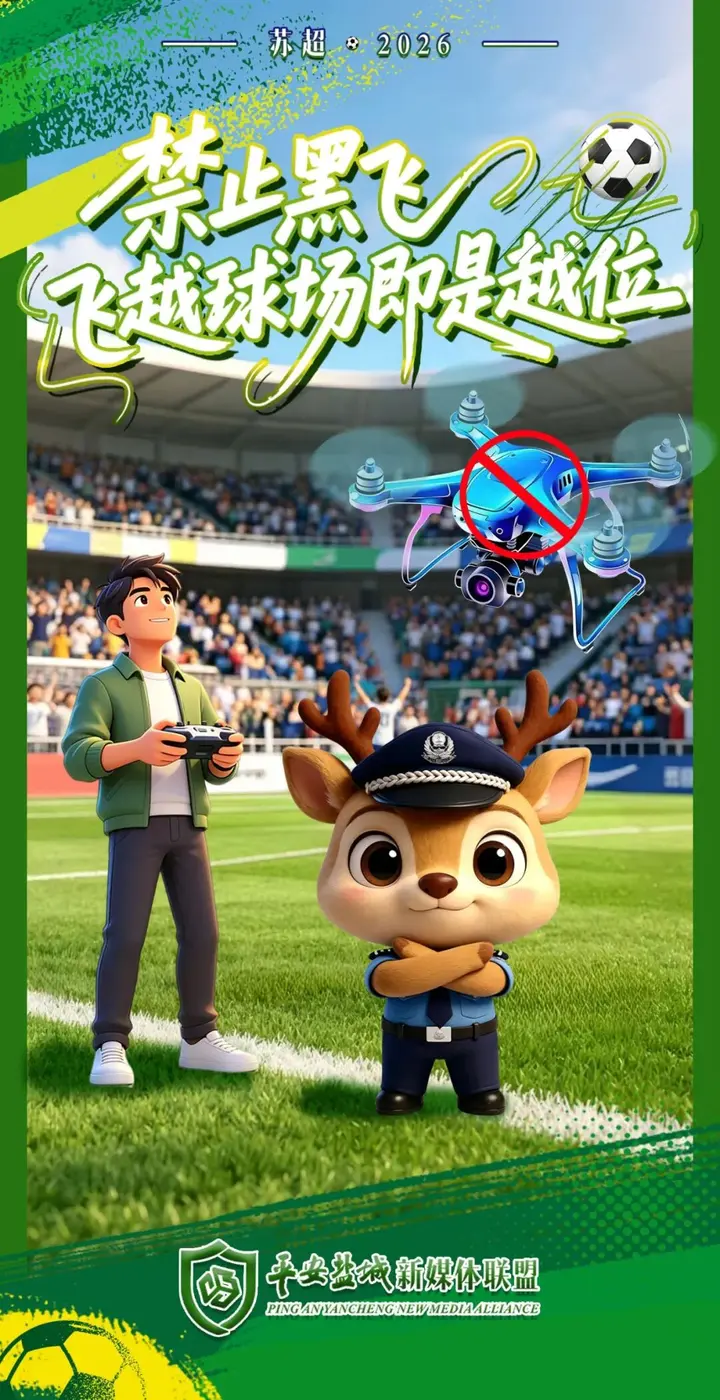 “2026年江苏省城市足球联赛(盐城赛区)盐城VS宿迁”所涉比赛场地在管制空域范围内,请广大市民及飞行爱好者自觉遵守管制空域相关规定,不得擅自升空飞行。如确有使用无人驾驶航空器进行飞行活动必要的,须按照有关法律法规,经军民航审批后,至现场应急处置指挥部报备,方可实施飞行。